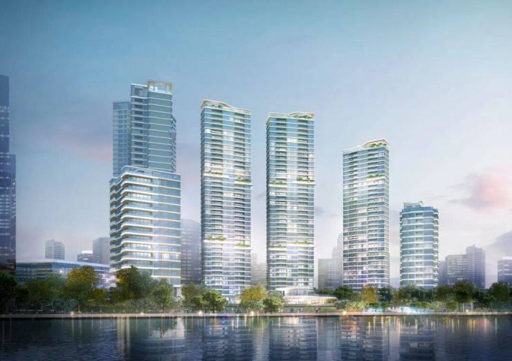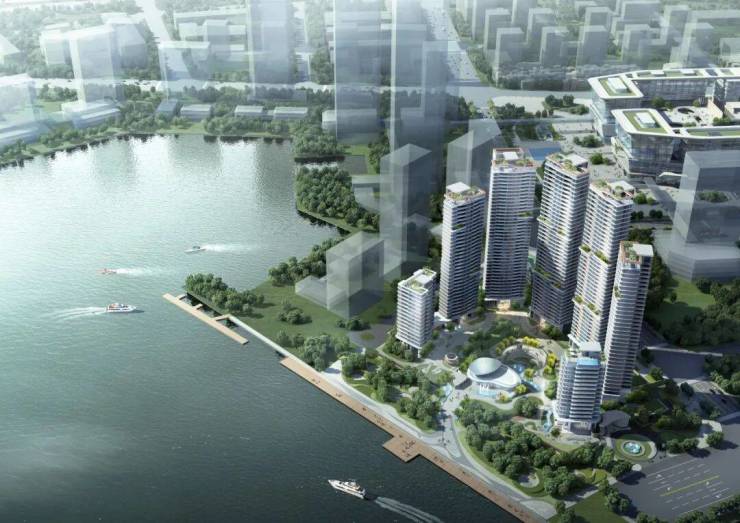 The project has a front line facing the river, enjoying 2.4 kilometres of riverfront and the natural landscape resources of the confluence of three rivers. The overall crescent-shaped layout, like a round of curved moon embedded in the harbour embracing the Pearl River, the building low in front and high in the back of the progressive design, to maximise the guarantee that every household overlooking the river of residential enjoyment.