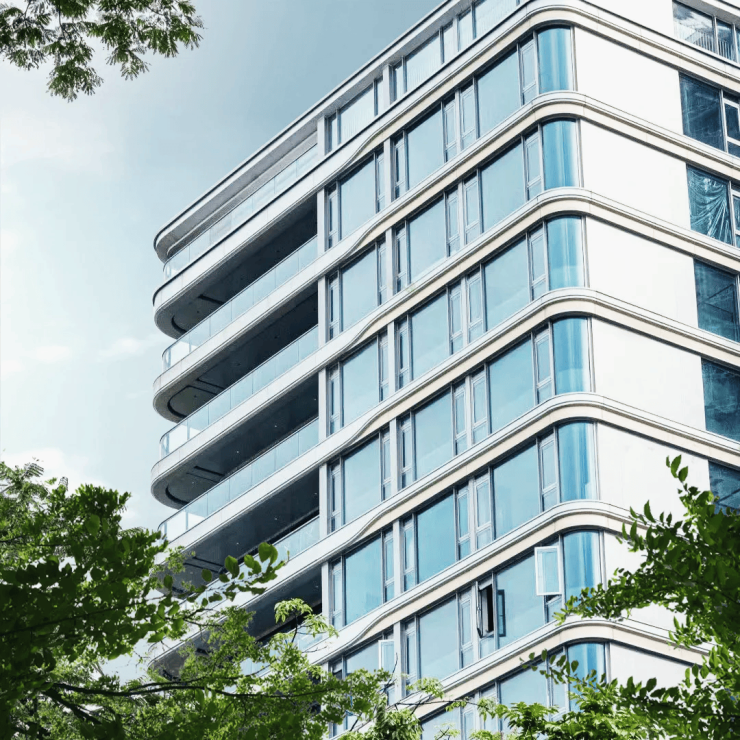 - In order to create IMAX-level canopy river view frames, the facade adopts customised 270°circular arc corner glass, curved processing trim, curved canopy is both taken with the pearl water in the same frequency of the curved design, to enhance the aesthetics of the building; at the same time, it also avoids the landscape cutting to the maximum extent, so that residents can enjoy the extreme vision of the river view horizons.