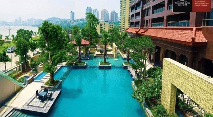 小区规划高端:绿化率 48%,中式园林 + 恒温泳池,三梯两户(主佣分道),一线海景、户户朝南,双套间 + 入户花园设计。