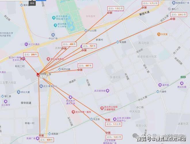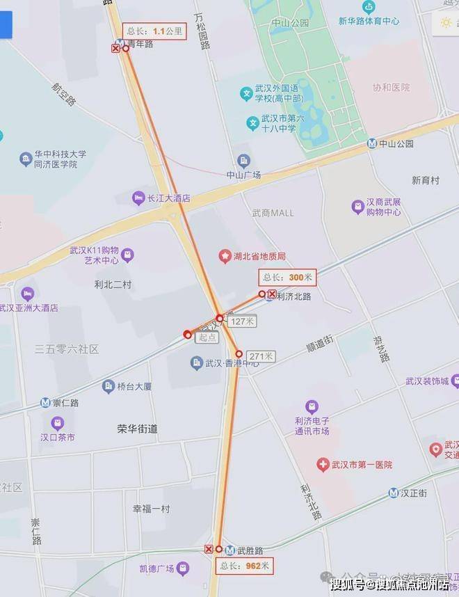 周边直线3km范围内有16个地铁站(利济北路、崇仁路、中山公园、武胜路、汉正街、青年路、友谊路、六渡桥、硚口路、王家墩东、循礼门、琴台、江汉路、取水楼、太平洋、武汉商务区),轨道交通发达,距离最近的地铁站是利济北路。
