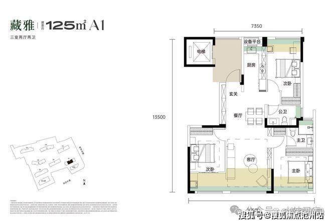 主推面积段115-170平米,最大得房率宣传超100%,但目前已对外释放的户型图包含2个,分别是115平的三房,以及125平的三房,都位于1号楼,也就是预计首推的楼栋,得房率大约在95-98%左右,后续会推出约143、170平米户型,但目前户型图尚未出炉。