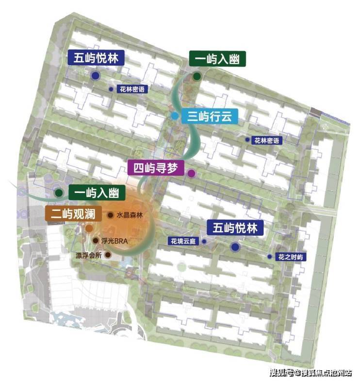 【景观打造】湾之屿园境美学,取江湾之形,置入园中,如一湾江水,在园中蔓延,与江湾的延伸带交相呼应;五大景观节点如小岛一般,坐落在江湾之中,五屿成轴,充满无限诗意。