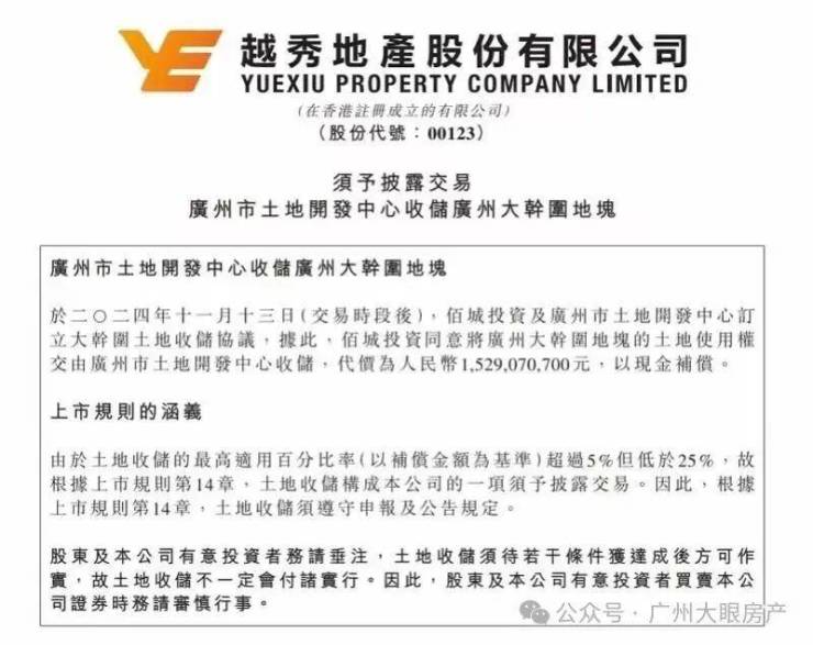 2024年11月13日,地块由广州土发中心中心收储,越秀地产因此将获得15.29亿元的现金补偿;