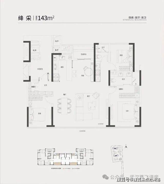 ②绛采143平户型,四房两厅两卫:处于两个单元的拼接位置,分布在1号楼和3号楼。这个户型属于比较常见的类型,采用典型的四开间朝南大横厅设计,四开间分别对应次卧、餐客厅与主卧;北向区域则规划了厨房、书房,以及另一间次卧和客卫。
