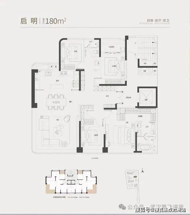 ③启明180平户型,四房两厅两卫:位于 2 号楼,同样规划为四房两卫格局。因户型实现三面采光,所以将 LDKB 一体化空间设置在东西向,并搭配 270 度封闭式阳台,主打观景功能。2 号楼处于小区内部,不靠近主干道,其中西边户能欣赏小区园林景观,东边户的景观视野则相对逊色。该户型的主卧空间规划得格外宽敞,这一点我个人比较认可;南向还设计有一间书房,北向则分布着两间次卧、一个公卫,以及一个开放式生活阳台。