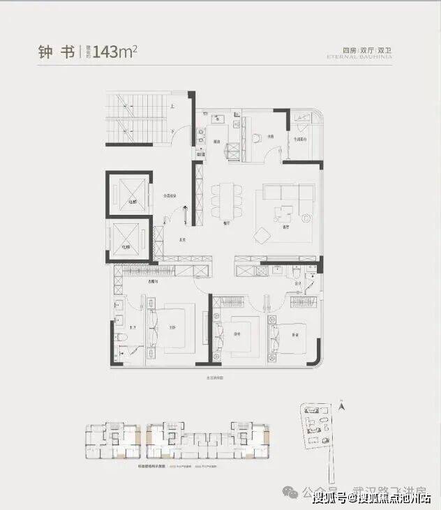 ①钟书143㎡户型:四房两厅两卫:拥有三面采光优势,分布在1、3号楼的纯边户以及4号楼。该户型餐客一体区域朝东或朝西,且与东西向的封闭式生活阳台相连;三个卧室均朝南,其中主卧面积格外大,几乎是另外两间卧室的面积之和。北向则规划了实用的开放式生活阳台、一间多功能房和一间厨房,个人觉得厨房面积和开间都偏小,但好在厨房与外侧一整面墙体相连,具备改造成中西双厨的条件。