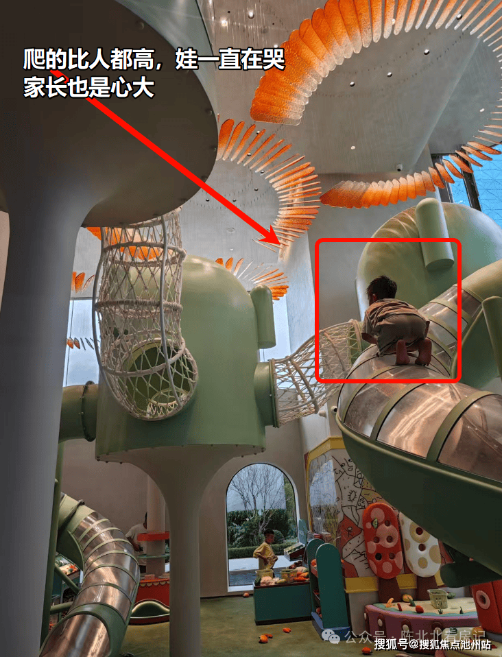儿童区算是展示的一大亮点,但是在走访过程中也发生了一个意外情况:一个熊孩子自己爬到这几米高的滑道上方下不来了。