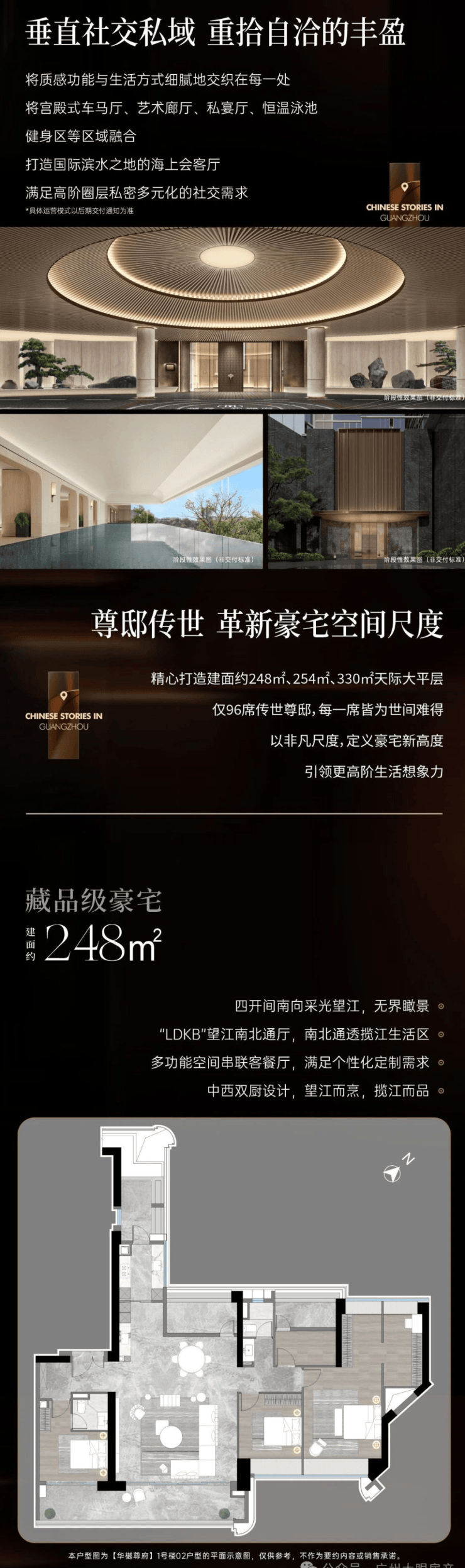 户型设计:项目主打 248 - 330㎡的天际大平层,仅 96 席,每一席都极为稀缺。以部分户型为例: