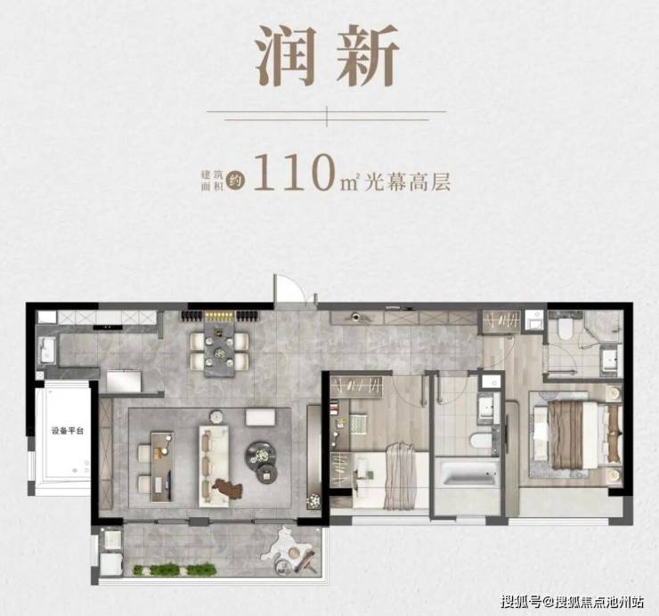 户型方面,110㎡户型非常创新,“一字”布局在苏州市面上几乎看不到同类产品。南向面宽达16米,三房两厅两卫设计,六开间朝南,整体采光无敌。不过这个户型南北不通透,狭长的过道也造成面积浪费。