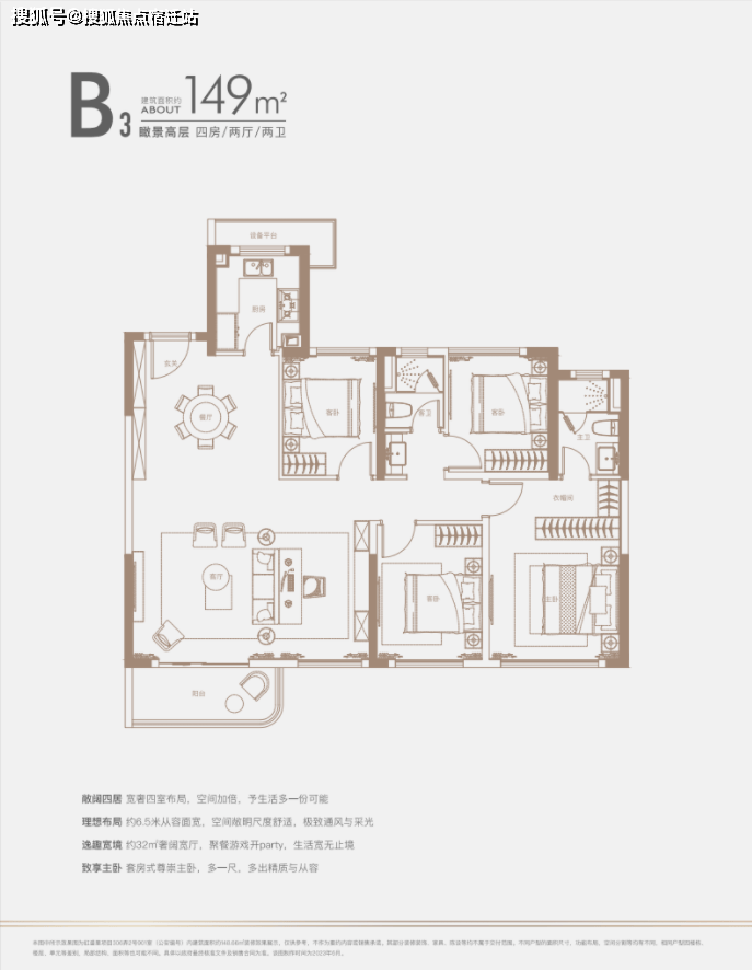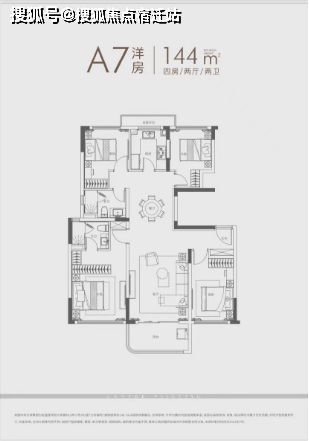建面约140㎡四房:三开间朝南户型,南北通透,采光条件优质,客厅明亮宽敞,彰显大气布局。