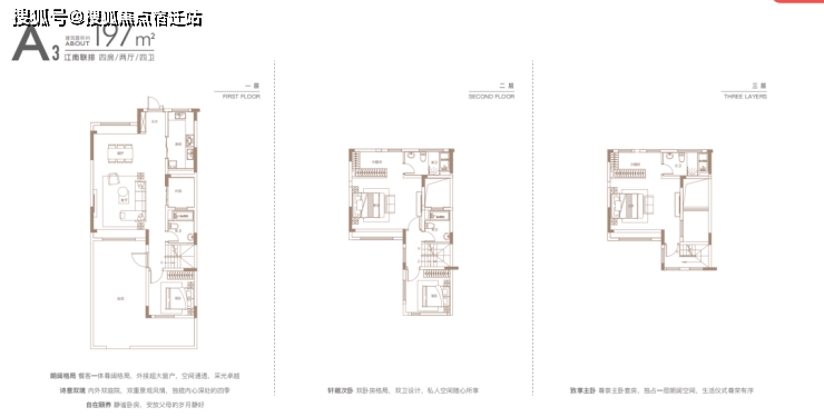 建面约197㎡滨水联排:四卫浴设计,贴心为居者考量,雍享从容的起居生活。