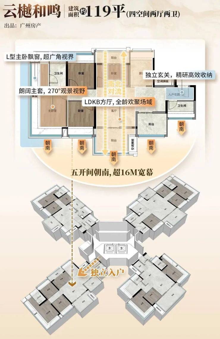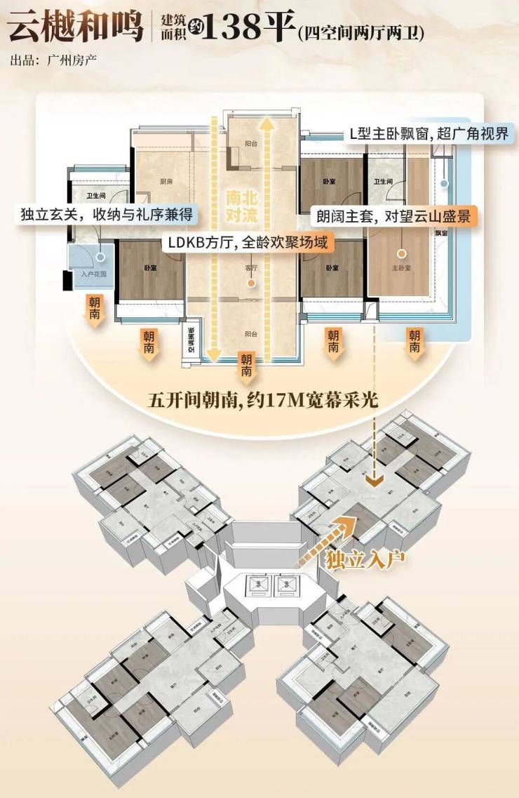 户型亮点:主打约 100-138㎡全南向四房,主力户型四开间朝南,南北双阳台,主卧 270° 飘窗,全屋 “800 库” 收纳系统,LDKB 一体化方厅提升空间利用率。
