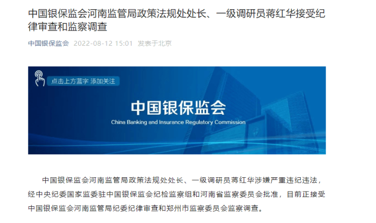 经中央纪委国家监委驻中国银保监会纪检监察组和河南省监察委员会批准,目前正接受郑州市监察委员会监察调查。