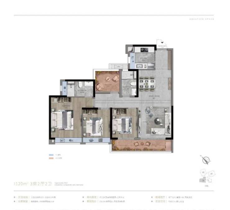 • A+健康居住家:配置景观大阳台、U型大厨房、贴心大玄关、品质系统门窗、中央空调、智能生活,居住更舒心
