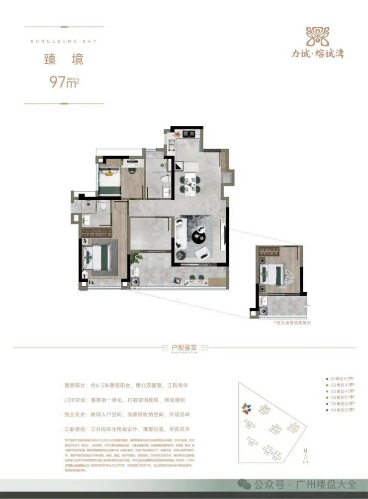建面约97㎡,江园双景臻席,不仅能欣赏花地湾江面卓绝风光,还能俯瞰榕诚公园,以及GVL怡境国际匠心打造的“山林麓畔 隐翠森居”主题大师园林,LDK餐客厨一体设计,约6.5米宽境阳台。