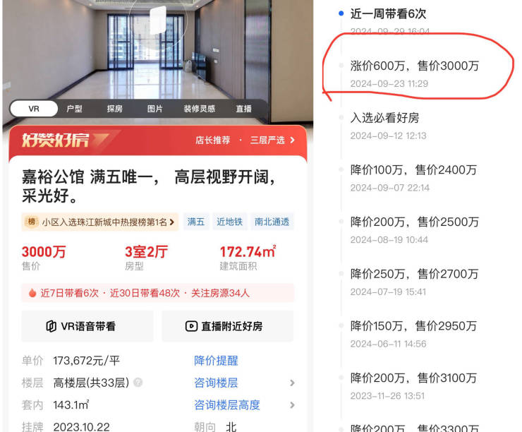 广州一套豪宅涨价更是出圈,嘉裕公馆有套172平高层,此前从3500万降价6次、下调至2400万,相比首次挂牌价下跌1100万,近期一次性涨价600万,报价重新回到3000万元。