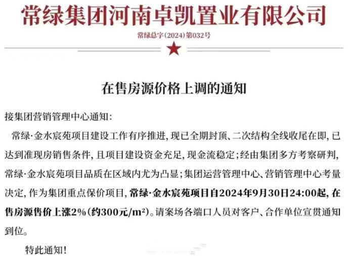 郑州也有楼盘加入涨价行列,9月28日,河南本土房企河南卓凯置业发文称,自9月30日24时起,对旗下常绿·金水宸苑项目在售房源售价上调2%,每平上涨约300元。