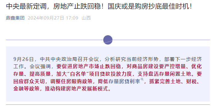 尤其是926政治局会议上 ,关于促进房地产“止跌回稳”,对商品房建设要严控增量、优化存量,以及调整住房限购政策的表述,极大的提振了市场。