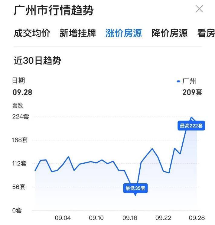 贝壳行情数据也显示,自9月25日以来,广州涨价房源持续增加,9月27日涨价房源达到222套。