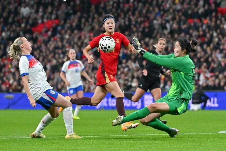 11月29日,中国队球员王妍雯(左)在比赛中进攻。 新华社记者 李颖 摄 赛后,英格兰队主教练威格曼评价球队在比赛中表现得“冷酷无情”。她说:“我认为我们开局非常顺利,对方采取了不同的阵型,因此我们必须做出调整。她们给了我们太多控球时间,而当我们获得这样的空间时,就能展现出真正的实力。队员间的配合十分默契,有几粒进球相当精彩。”