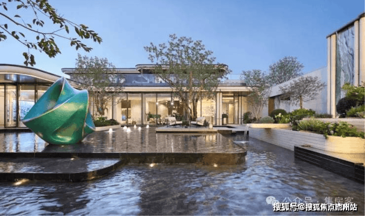 约7米高的主入口,把贝金米黄石材、维多利亚绿等名贵石材,与古铜色金属板、紫薇等名贵草木巧妙搭配、相得益彰,犹如穿着翠绿华服的翩翩公子,透着一身贵气。