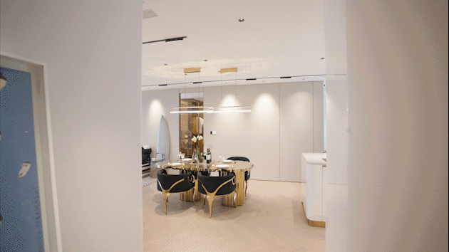 入户后,是一个极为奢侈的客餐厅,超大南向面宽+约3.08-3.4米的层高,整体室内的空间感、通透性都相当惊艳。