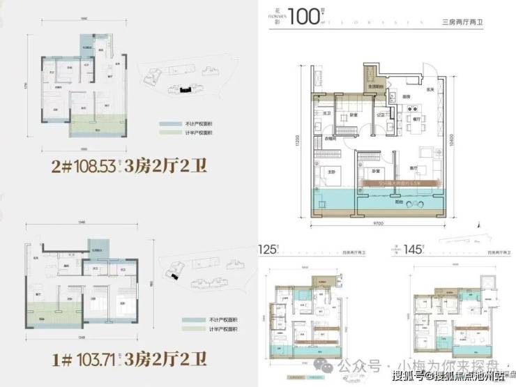 从规划方案来看,该项目由3栋18-33F住宅和部分社区底商组成,体量不大,总户数308户。项目主推建面约100、125、145㎡三房、四房,打造新四代住宅,约95-105%超高得房率。