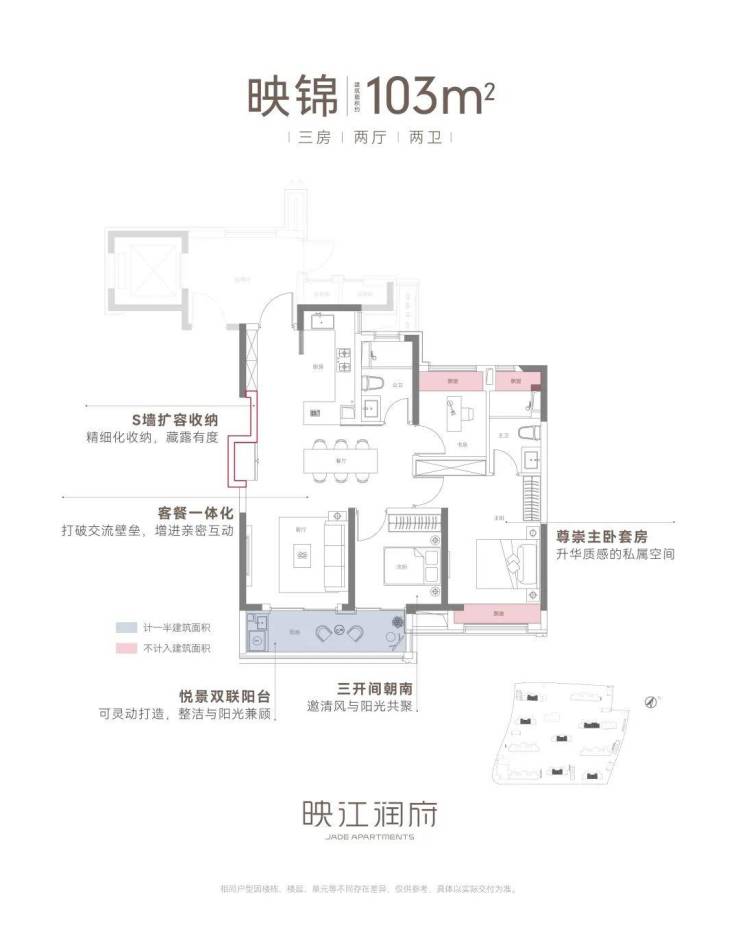 建筑面积约103㎡三房两厅两卫,不失为改善家庭的首选。其中边套户型,映江润府的主卧套房做了 270°环幕飘窗,实现无与伦比的采光通风和视野享受,类比于千万级豪宅的体验!