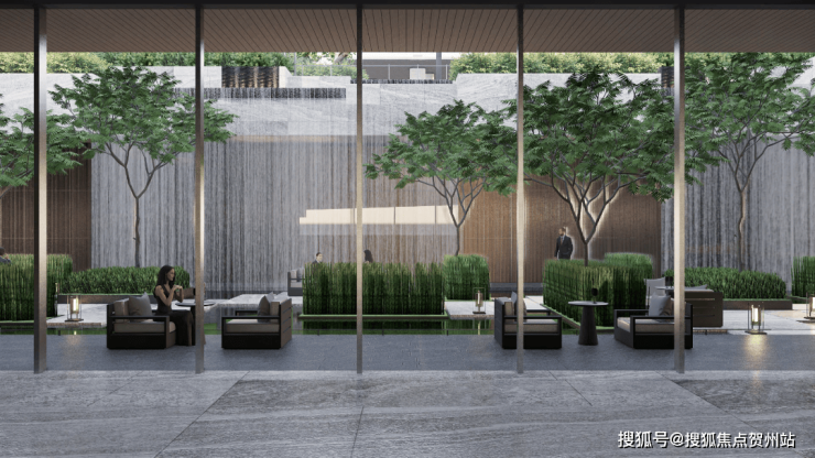 地下车库入户大堂前车马厅设计,借鉴了“港式归家”的理念,一般多在香港高端酒店采用,作为归家的第二道门,既温馨明亮,又超具昭示性。酒店式归家大堂与定制化下沉会所相结合,在负一层引入瀑布景观,整个景观体系更加立体。