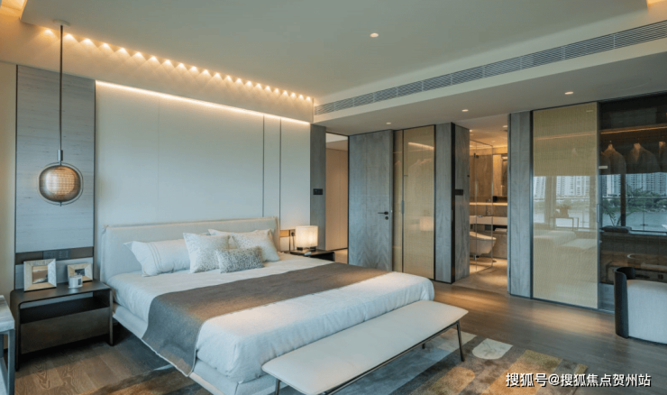 酒店式套房主卧,“类折叠屏”飘窗可270°瞰景,自带男女衣帽间和梳妆台,超大卫浴间四件套,同时做到了双面采光。
