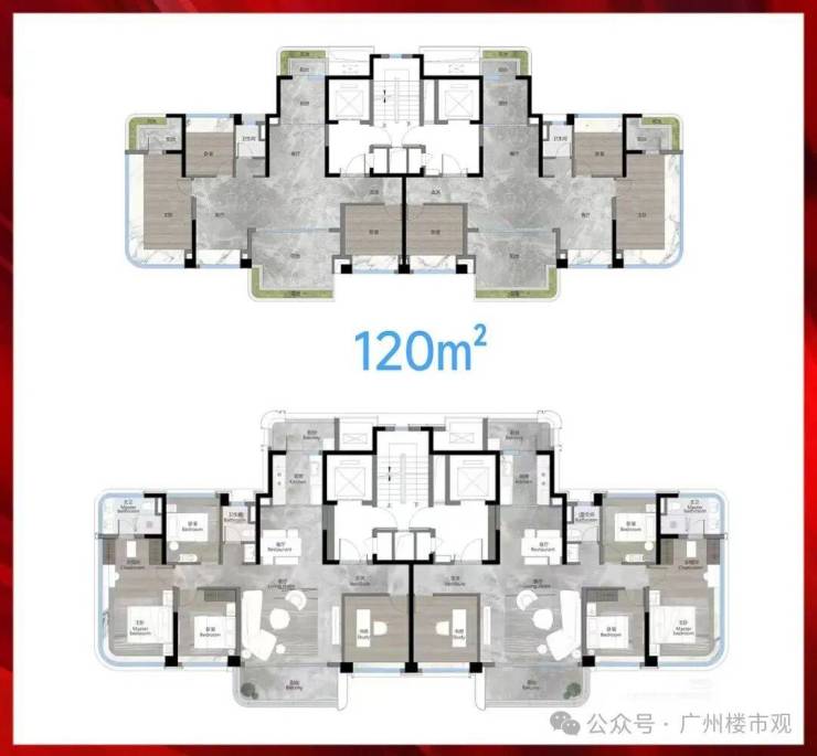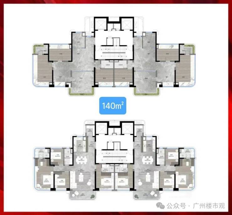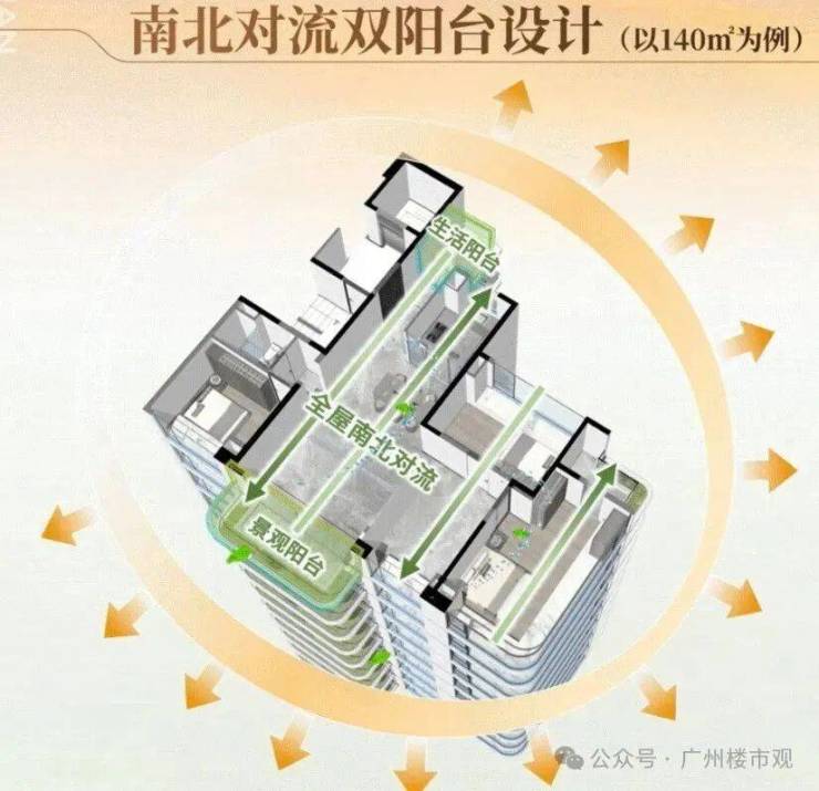 其中,140平为主力户型,而120-140平中型改善的配置,也是目前海珠区供应比较稀缺的。全系南北对流双阳台设计: