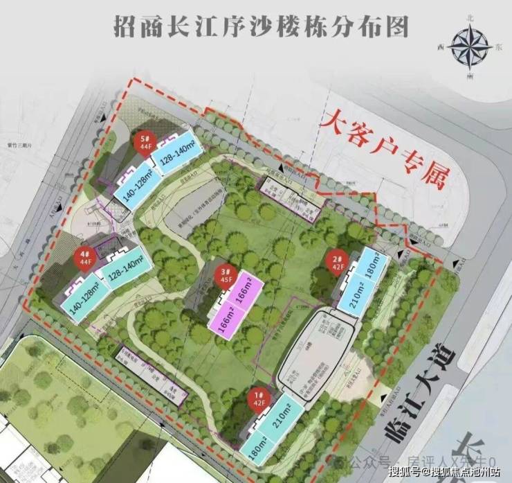 招商地块,一共5栋住宅,住宅高度42-45F,首层全架空,大概有588户,户均221m²。从效果图来看,流线型玻璃幕墙立面,大概率有270°转角观景窗,大门约52米宽,高层4F,4F配套会所看江泳池等,入户后就是户外的下沉庭院等,案名大概率是【招商长江序】,招商地块东南朝向,一线临长江,1、2号楼在第一排,看江无遮挡,对面为积玉桥。3号楼位于第二排,左右侧面还是会收到一定的视野遮挡,三排4、5号楼估计就是夹缝看江了。