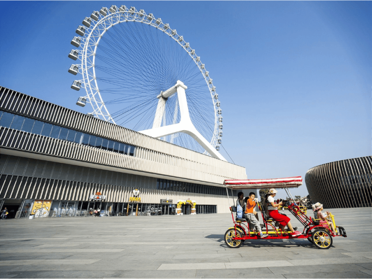 湖岸西路往西,便是著名的“打卡圣地”——亚洲第二大屋顶摩天轮。白天登上摩天轮,在101米高空中俯瞰万亩湖山,心情格外舒畅;夜晚搭配着音乐喷泉,欣赏五光十色的夜景,也别有一番韵味。