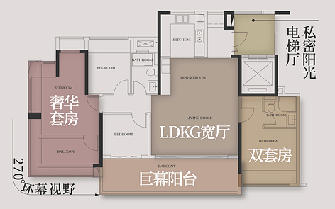 约8.4米南向巨幕阳台,主卧270°飘窗,能最大程度引园景入室。
