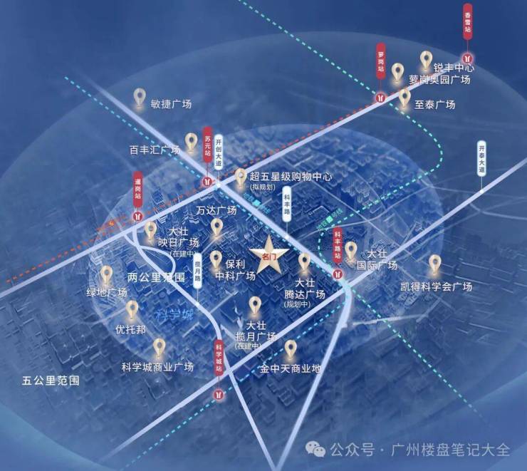 大壮名城·名门占据城市核心地段——科学城核“芯”黄金2公里(科丰路与开创大道的十字路口交汇处),集聚政务中心、商贸中心、发展中心于一体