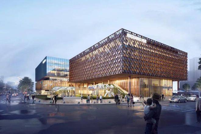 且商业街区质感极高,立面用的是和紫薇之星相同的材质,同时预留了外摆,将社交元素融入到商业底盘中。
