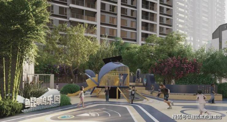 以“鲲鹏乐园”主题儿童乐园、鲲鹏书院、老人颐乐空间、多元艺术花园、约760m“汽车文化”主题跑道、森林漫步道等共享场域为居者构筑一个有温度的社区.