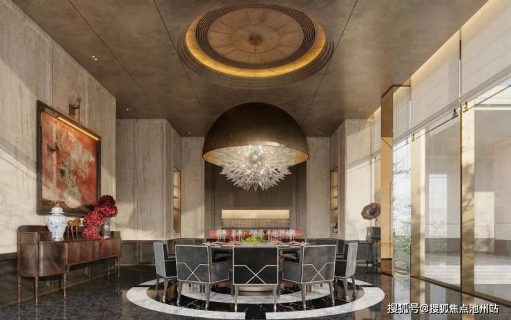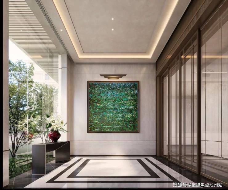 这扇低调奢华的大门背后,是6米高的绿陶板环形门庭 (如头图) 。这扇门,将是中北路上奢雅的豪宅大门。大门内是隐奢生活,大门外是繁华都市,真正大隐于市。