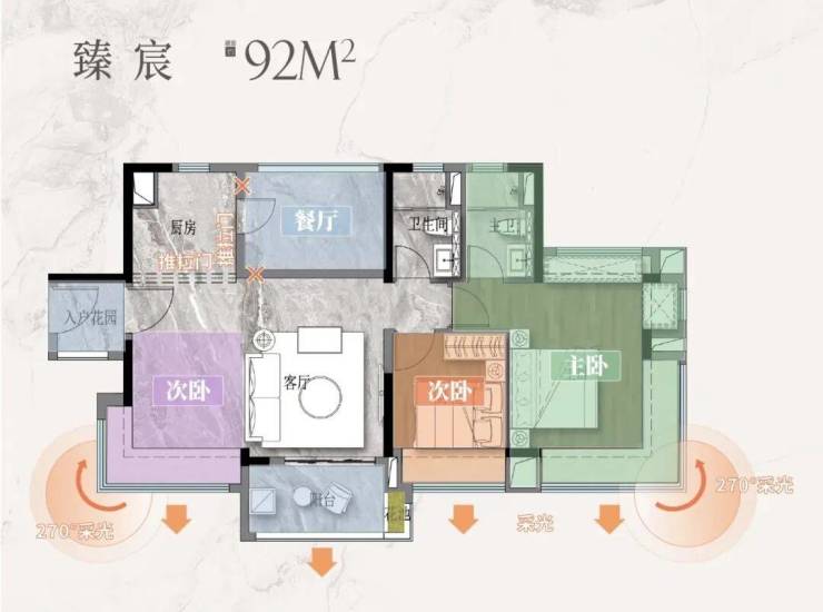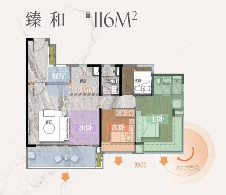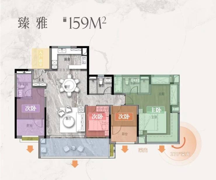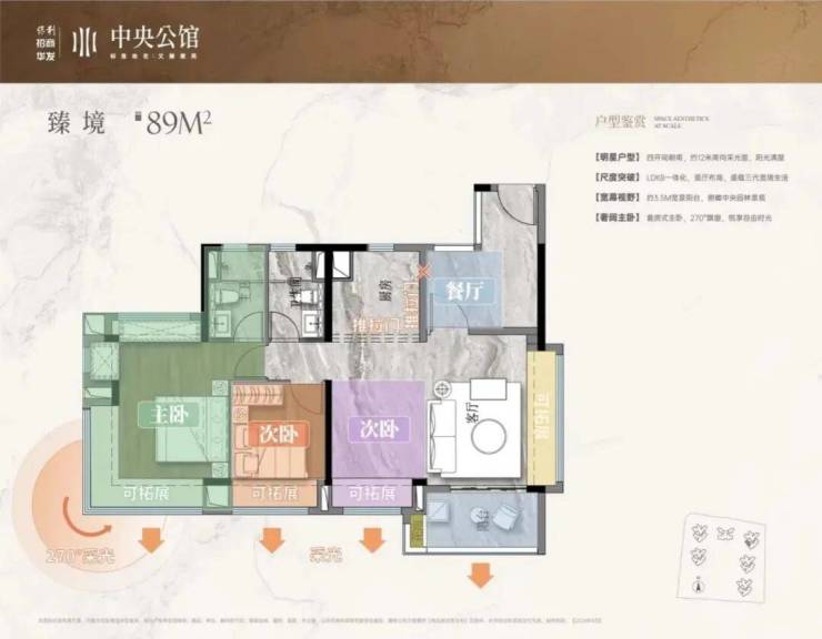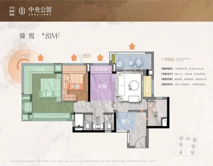 户型设计灵活,涵盖81-159㎡三至四房,部分户型使用率超100%,主卧配备270°采光飘窗,空间利用率高。