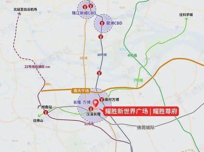 耀胜新世界广场项目位于万博-长隆商圈三轨交汇枢纽之上,三号线和七号线及佛莞城际轨道线交汇, 生活圈串连起珠江新城中央商务区、高铁南站及白云机场,快速便捷辐射东莞、广州、佛山三个大湾区城市。