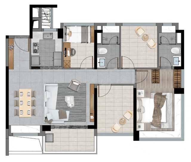 其中,主卧采用酒店式套房设计,且带有270°转角大飘窗,视野阔绰。