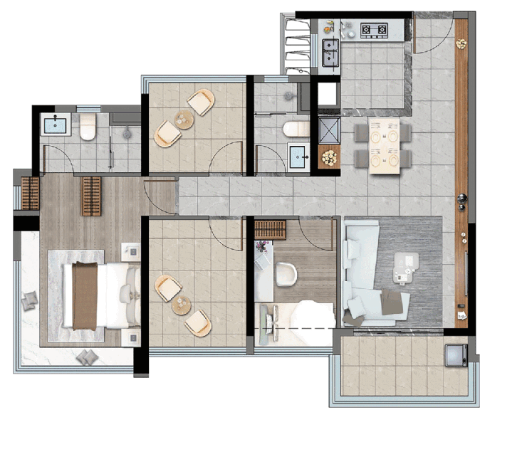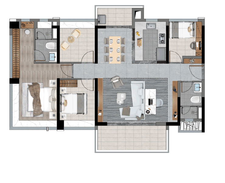 书房、茶室、儿童乐园之间自由组合的多元X空间,做到了多1房;客餐厅的大横厅设计,空间感更好;主卧270°转角飘窗,带来更大的采光、景观面;U型厨房、定制岛台,可以让做饭充满乐趣……
