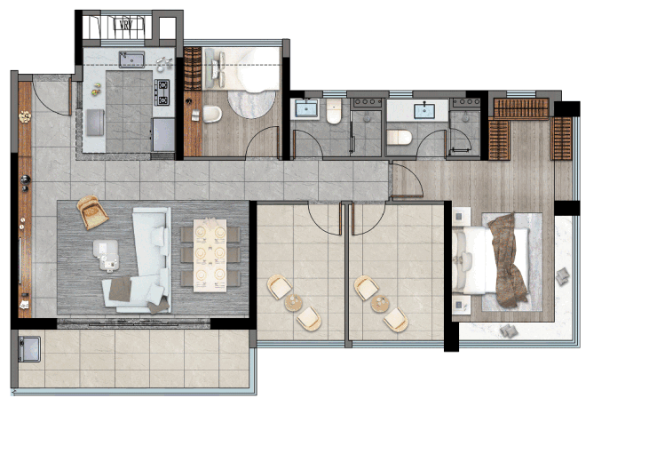还有另一个建面约130㎡的南北双阳台户型,南北对流更加通透,南向的观景阳台尺寸更是堪称奢华,还做到了三面观景,北向的阳台则可以用作生活阳台,日常生活与绝佳美景互不耽误。
