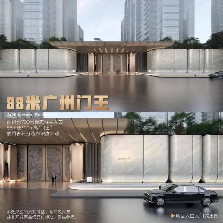 尤其值得一提的是,项目大门长达88米,高达10米,被誉为广州门王,大量运用奢华石材,彰显非凡气派。