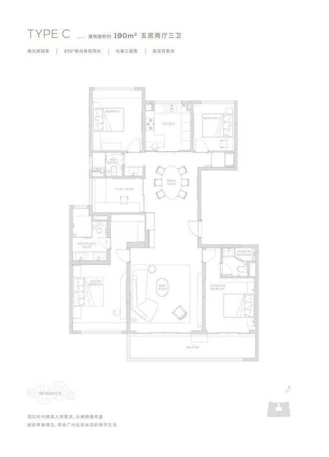 【190㎡户型】南北双园景-光幕三面宽-270度超广角观景视野-经典四叶草布局