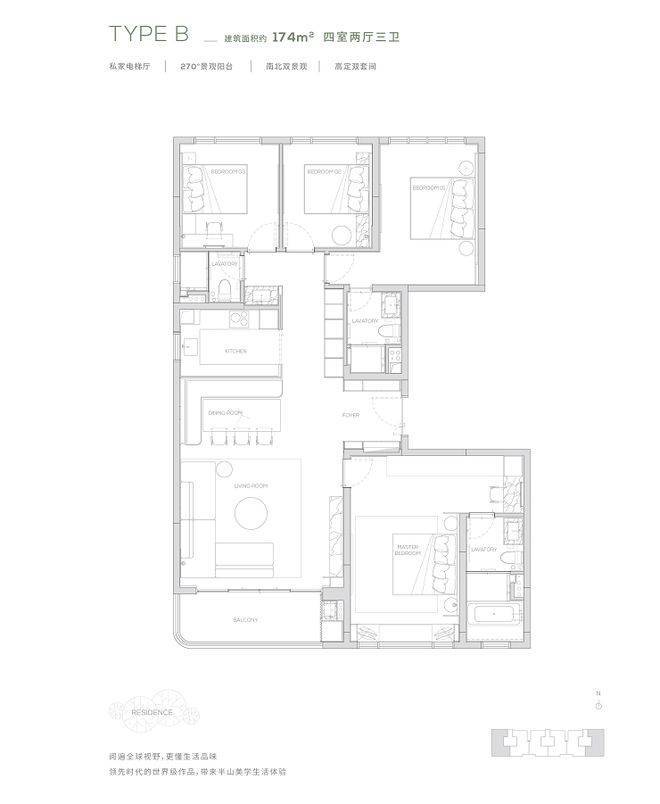 【174㎡户型】独享私家电梯厅-270度环幕观景阳台-高定双套间