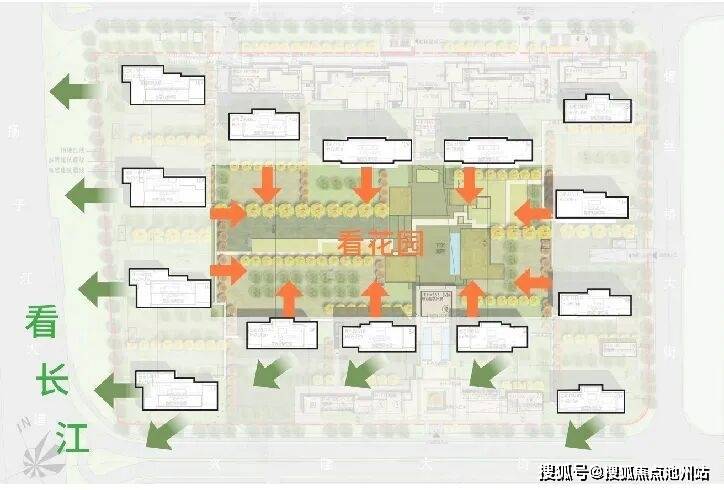 再介绍排布特征。实际上,在这一版建筑排布之前,金陵月华拟定过其他方案,按照前期思路,小区中心会建有一栋中心楼王。最终,为了保证江景资源的充分利用,开发商选择拿掉一栋楼,将住宅南北两侧错开式排布,也就是目前确认的这一版。