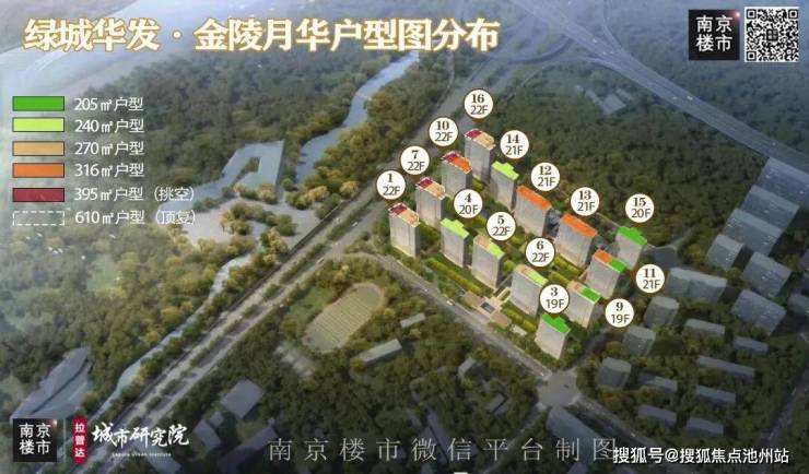 先说大规划。金陵月华共14栋19-22层住宅、3栋商业及配套设施。住宅约552套,建面约205、240、270、316㎡,另有76套395㎡挑空户型以及4套610㎡顶复。其中建面约300㎡以下户型,层高约3.3米。建面约300㎡以上户型,层高约3.5米。建筑栋栋架空,架空层层高统一约5.4米。