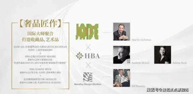 全球顶级建筑设计机构:JADE&QA(上海世茂深坑酒店、迪拜的 Jumeira Beach Hotel)全球顶级室内设计机构:HBA设计(苏州莱佛士酒店、成都费尔蒙酒店、河内洲际酒店、印尼洲际酒店等超是个五星级酒店设计)