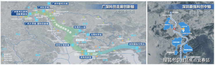 🏙两轴:广深科创走廊创新轴-研发创新节点和深圳最强科创中轴-制造创新节点,东起深圳国际生物谷,西至广州琶洲互联网创新集聚区、南联深圳科技园和后海商务区,北接松山湖,肩负共筑“创新脊梁”的重要使命